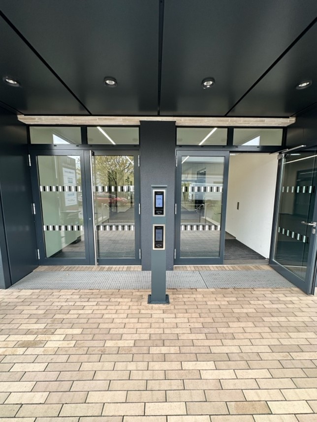 Die OSMAB Gewerbe GmbH entschied sich für die Absicherung des Geländes mit dem intelligenten, vernetzten Zutrittskontrollsystem Net2 von Paxton. Dieses System wurde speziell zur Vereinfachung des Gebäudemanagements entwickelt und bietet ein hohes Maß an Integration. Es bietet benutzerfreundliche Funktionen, die über die bloße Steuerung des Personenflusses hinausgehen, einschließlich Gebäudemanagement und Systemintegration. Für die Außenbereiche wurden Touch-Sprechstellen installiert, während die Innentüren mit Kunststoffplatten ausgestattet wurden. Jeder Mieter erhielt innerhalb seiner Mietfläche einen Tischmonitor und es wurde eine SIP-Verbindung zu Smartphones eingerichtet. Im Gebäude wurden zwei Concierge-Schaltungen implementiert. Türen ohne Gegensprechanlage und die Aufzüge wurden mit Mehrantennenlesern ausgestattet, sodass Mieter mit bestehender Zutrittskontrolle ihre bestehenden Karten weiterhin nutzen können. Für die Cloud-Lösung wurde das Virtualisierungsportal der MOI Service GmbH genutzt, sodass das ursprünglich nur offline nutzbare Net2-System nun als Cloud-Lösung betrieben werden kann. Mieter können über das Portal ihre eigenen Zugänge in einer besonders geschützten Umgebung verwalten. Darüber hinaus wurden in einigen Mietflächen digitale Schließzylinder in das System integriert und können über die Net2-Software verwaltet werden. Aufgrund der hohen Nutzerzahl wurde das Software-Plugin „Inaktive Karten“ implementiert, um ungenutzte Karten im System zu identifizieren und so das Missbrauchsrisiko deutlich zu reduzieren. Ein Mieter ließ außerdem das Zeiterfassungssystem von Paxton installieren, das eine eigene Datenbank nutzt. Die Hauptzugriffskontrolldatenbank dieses Mieters wird in die Datenbank des Zeiterfassungssystems gespiegelt, sodass der Kunde nur eine Datenbank verwalten muss. Speziell zugeschnittene Arbeitsberichte werden dem Mieter per verschlüsselter E-Mail zugesandt. Darüber hinaus wurde das Zutrittskontrollsystem in das Gebäudemanagementsystem Advancis integriert. Für die mietbaren Tagungsräume wurde Annys Raumbuchungssystem an Net2 angebunden. Um den hohen Netzwerkanforderungen gerecht zu werden, kamen Barox-Produkte zum Einsatz. Das gesamte System ist durch Echtzeitüberwachung abgesichert und bei Störungen wird das OSMAB automatisch benachrichtigt.